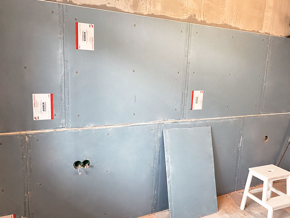 Как обычно, клиент очень долго выбирал, и перебрал наверное все возможные решения. Но, в конечном итоге, остановился на звукоизоляционной системе с применением плит Amber SoundStop panel.